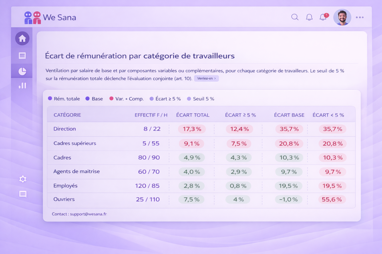 We Sana est un logiciel conçu pour aider les entreprises à structurer et piloter leur démarche de transparence salariale, en combinant analyse, conformité et dialogue social.